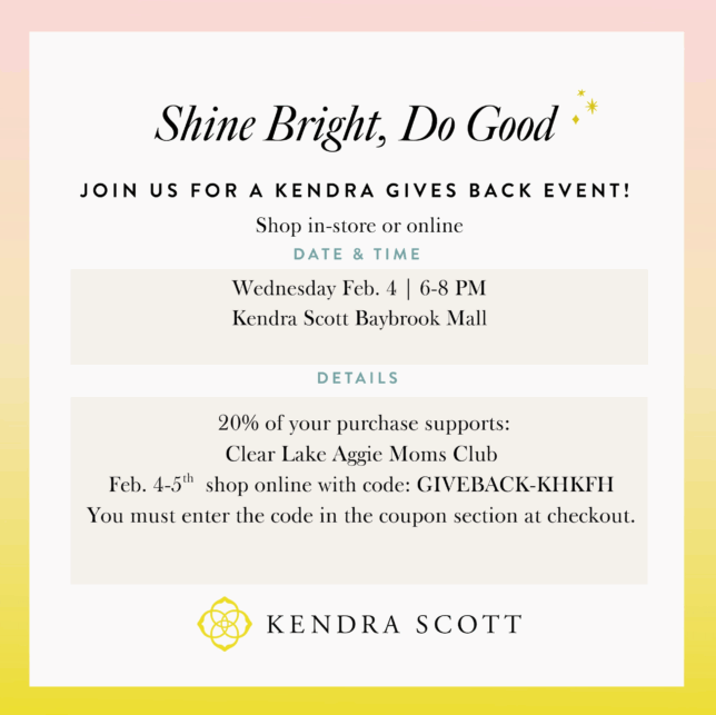 Join us for a Kendra Scott Give Back Event Shopping from 6 – 8 pm Meet us for an early happy hour @ 5 pm! Gloria’s Latin Cuisine, Baybrook Mall
